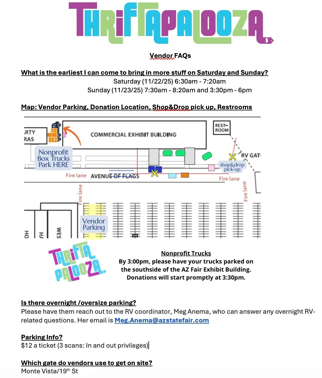 Vendor vehicles should be in vendor parking by 7:20 AM.